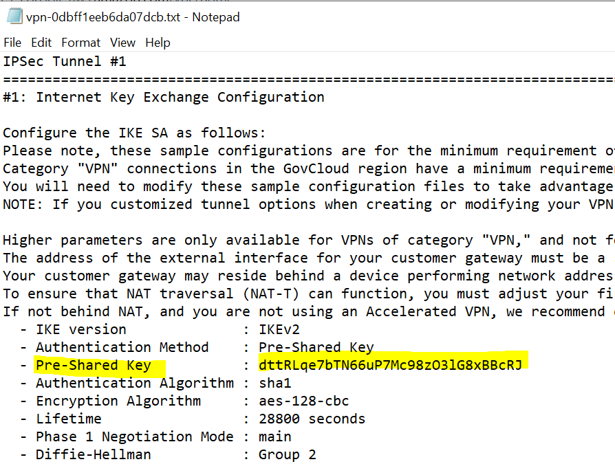 This will download a text file having VPN connection configuration details for establishing the IPsec tunnel like a pre-shared key, VPN Gateway public IP address, etc.